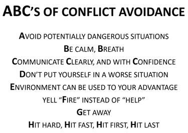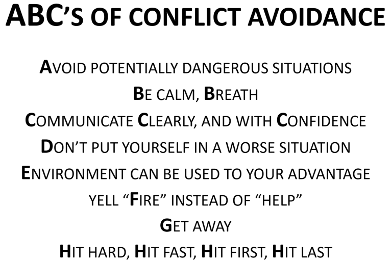 A. Avoid potentially dangerous situations. Sounds simple doesn’t it? Well, it is. Just stay away from those areas of town that seem “seedy” or run down. Park your car in well lit areas near the front door wherever you are. Go places in groups of 2 or more because there is security in numbers. Be aware of your environment AT ALL TIMES.