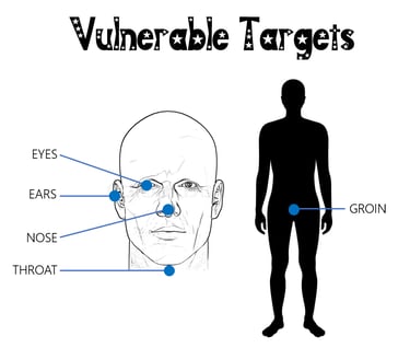 The eyes, ears, nose, throat, and groin are five highly sensitive areas that leaves every attacker vulnerable.